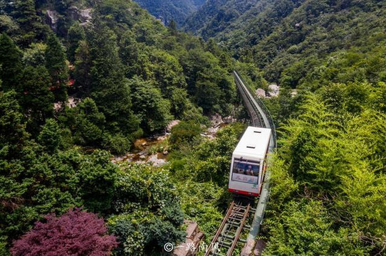 三叠泉缆车也叫森林小火车,是目前亚洲最先进的有轨缆车,全程1496米,高差152.6米,期间穿梭于山林之中并跨沟越溪,沿途景色美不胜收,用无人机升空航拍,视觉效果更加灵动、震撼。