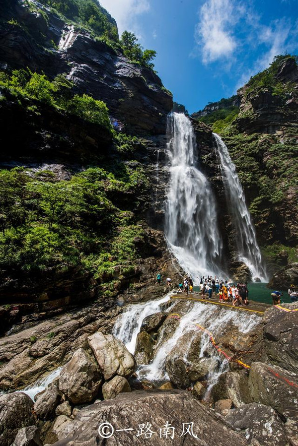 三叠泉瀑布的总落差为155米,除了最著名的三叠瀑布,上游还有很多溪流小景,不过游客一般直接到瀑布底部的观景平台观景。