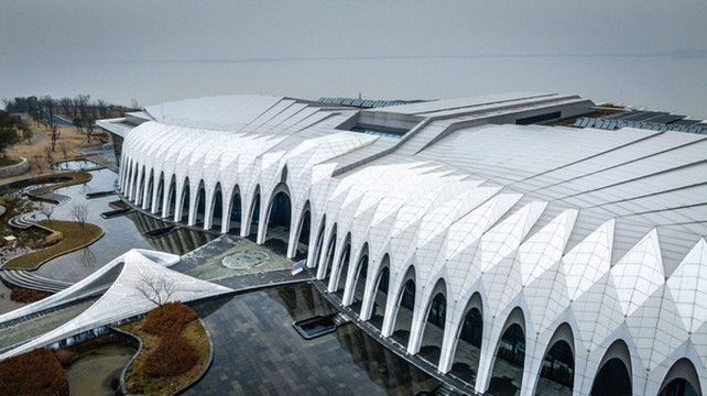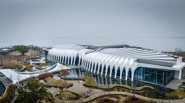 除了几处观鸟点,候鸟小镇的会议展示中心也值得一看,中心位于湖畔湿地之滨,就宛若天边飞来的一只白鹤,栖息在湖天一色山水之间,身姿颀长舒展,鹤羽洁白无瑕,整体好看,细节也非常抓眼球,白色羽毛垂下形成柱廊,也使得建筑立面的轮廓更为丰富。楼顶三维的造型,仿佛密密的羽片,构成了建筑的主体屋顶,白鹤的翅膀形态就“跃然纸上”了。