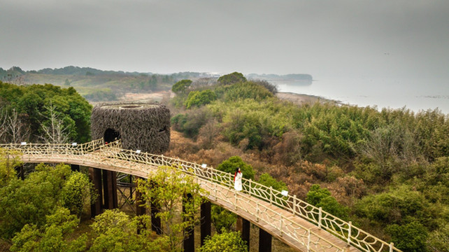 第二处是大湖池观鸟点,标志是一条弧形的空中观鸟栈道,这是 鄱阳 湖国家级自然保护区内最大的核心湖,也是世界极危物种、国家I级保护鸟类--白鹤的主要越冬地,此外还能看到白头鹤、白枕鹤、鸿雁以及黑鹳、灰鹤、小天鹅等,是候鸟越冬的重要位点。
