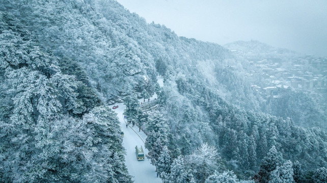 出发的早,作为初行者的我们尽情享受着这一路的雪景,如少女般圣洁。我们今天观雪的线路是从附近望江 亭到牯岭街再到如琴湖,第一次爬“雪山”选了一条短的路线。站在登山口往下看,上山的路弯弯曲曲,九九盘转而上,已被积雪完全覆盖,就算是熟悉道路的观光车,行驶起来也要小心翼翼。