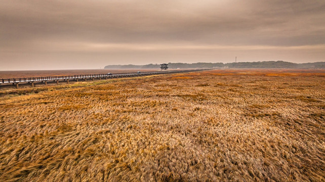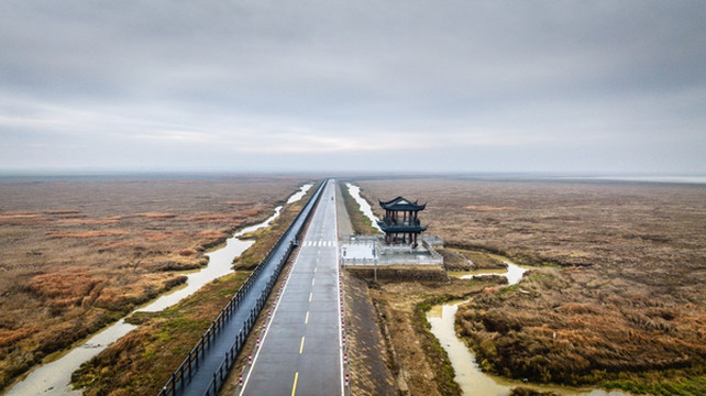 接下来,给大家介绍下候鸟小镇的几处绝佳观鸟点,第一个是入口处的网红公路,夏天丰水期,这是网红的水上公路,冬季时湖水退却,就成了绝佳的观鸟平台,沿着公路有条长长的栈道,水草之间藏了很多候鸟,能一直听见它们的鸣叫。