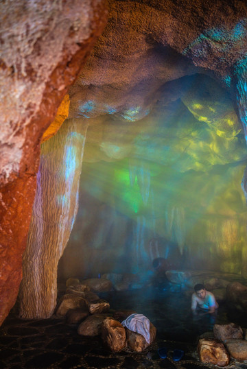 在60多个各式泡池中,溶洞温泉是设计得最为独特的一个,跨入洞中,如同来到了另一个世界,溶洞内钟乳林立、云雾弥漫,冬暖夏凉。加上朦胧的灯光效果,若隐若现,流水咚咚,犹如仙境,置身其中,惬意尽享!
