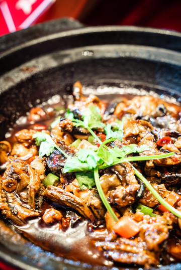 选用 庐山 阴涧岩壁洞穴中的蛙,经过多次加工清洗后加辣椒、花椒、香菜、芹菜根等配料炒熟,炒熟后的石鸡色泽深黄且香味十足,肉质细嫩口感甚佳,喜欢口味重一些的朋友一定会喜欢 庐山 石鸡。