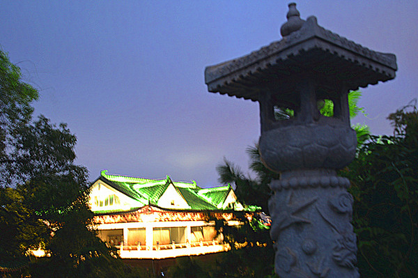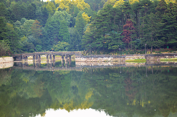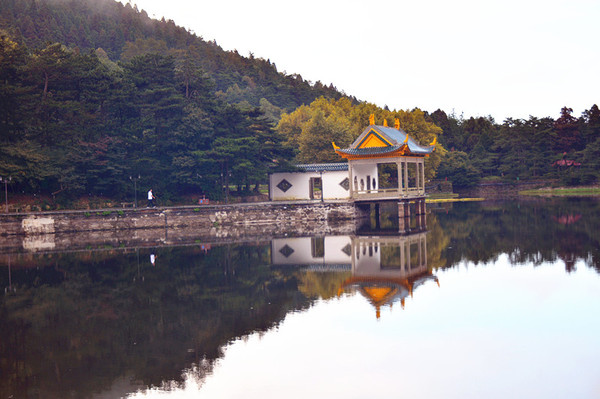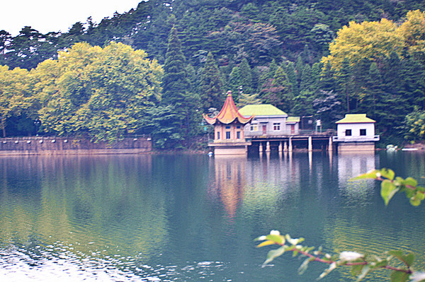 来到湖的时候已是华灯初上,没能绕湖一圈。湖水洁净清澈,碧清如镜,山色倒影,相映成趣。湖心有两小亭,外观秀丽、精巧,为湖面增光添彩,内则分别用作汲水塔和溢洪道。