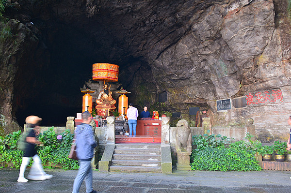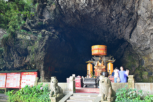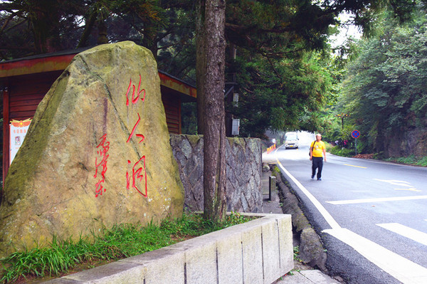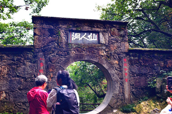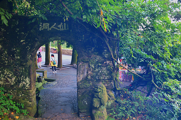 仙人洞。仙人洞位于锦绣谷的南端,海拔1031米,洞高、深各约10米,是一个由砂崖构成的岩石洞,是庐山著名景点之一。由于大自然的不断风化和山水长期冲刷,慢慢形成天然洞窟,因其形似佛手,故名佛手岩。相传唐代名道吕洞宾曾在此洞中修炼,直至成仙。后人为奉祠吕洞宾,将佛手岩更名为仙人洞。仙人洞在佛手岩的覆盖下,一洞中开为仙人洞。洞壁有“洞天玉液”等石刻题词,洞中央“纯阳殿”内置吕洞宾石像。至清朝,佛手岩成道家的洞天福地,改称仙人洞。毛泽东同志的著名诗句“天生一个仙人洞,无限风光在险峰”描述的就是这里。