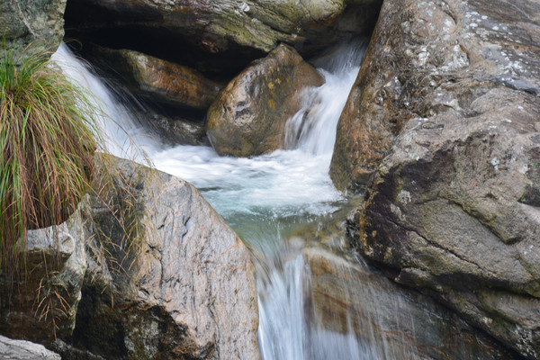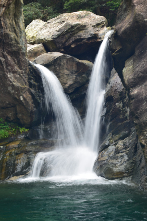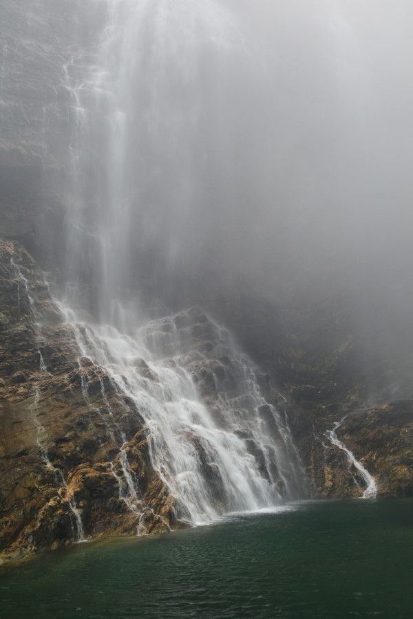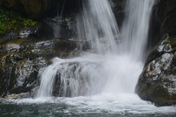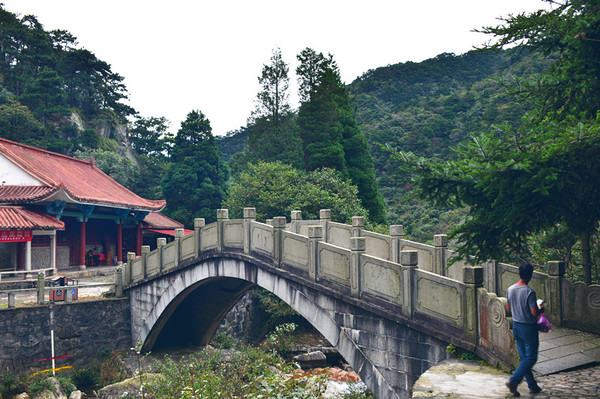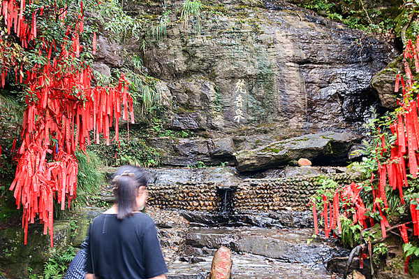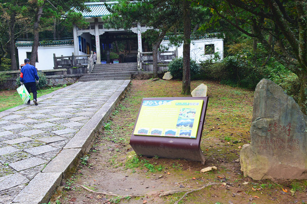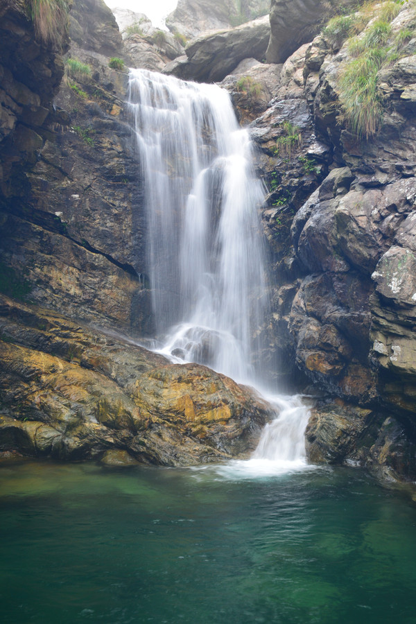 由于云雾的原因,除了眼前以外,山腰及山顶一概看不到,除了走走走还是走走走,一路也没遇到令人惊喜的地方,不过这个铁壁精舍算得上一处,据说山顶奇峰--铁壁峰在此仰望最有气势,也是一头雾水,真应了那句“只缘身在此山中”。正在无聊处,过了铁壁精舍,只听得涛声,总算看到了另一个令人难忘的景点----一条瀑布。水是无色的,那个水清的让人都怀疑,水又是有颜色的,看那一滩绿。