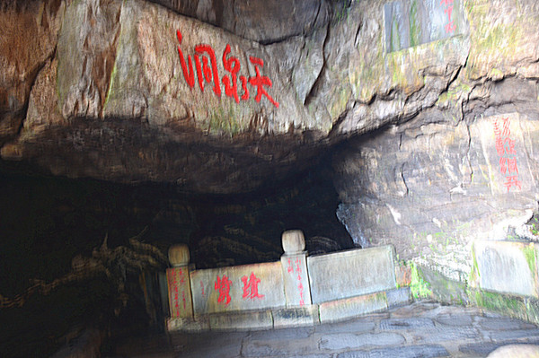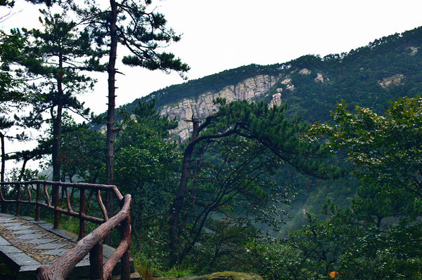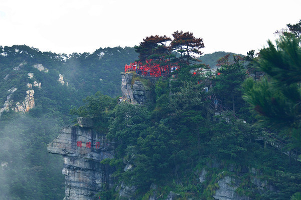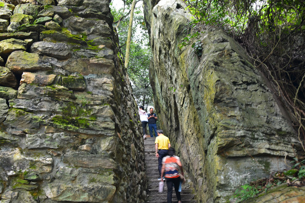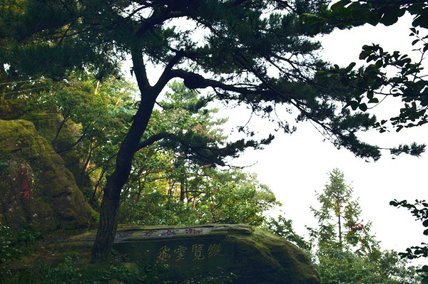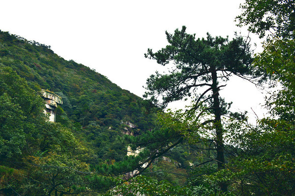 石松。此处峭壁巨石凌空而卧,似剑直插锦绣谷,又宛若一只大蟾蜍伸腿欲跃,人称“蟾蜍石”。石上有一松,名为石松,生机盎然,根须裸露,迎风挺立,坚强不屈。近代不少历史名人于此处留影纪念。但此处选景角度实属不易,很难拍出凌空效果。