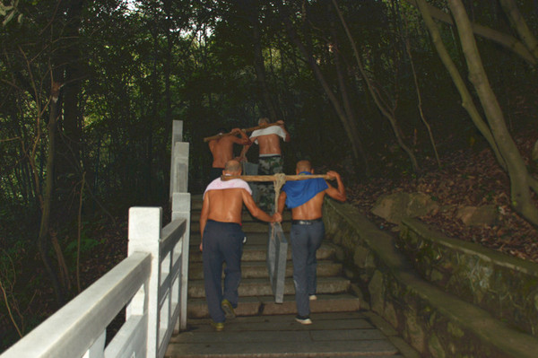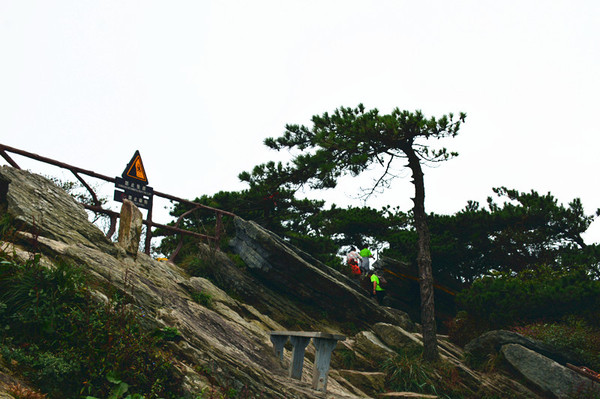 由于景区改造,不少路段处于升级维修中,所以才有以下这个提醒,路上也看到了汉子们抬着石栏杆、石板之类的,真为他们的辛苦付出点赞,游客徒步有时还累的气喘吁吁,可他们步履从容,不急不躁,油光的皮肤浸着汗水,给这个阴沉沉的令人压抑的山路注入了无穷活力。