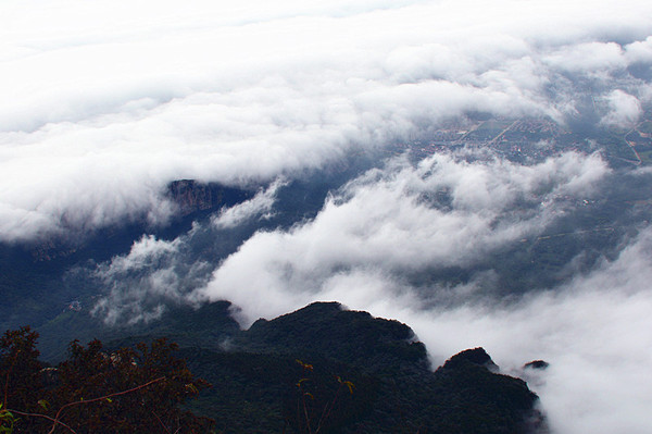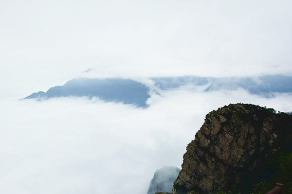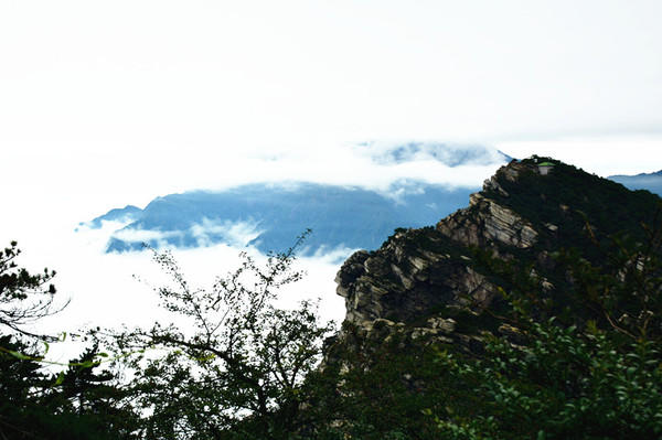 五峰,海拔1359米,又名目无障碍峰。在五峰待了好大一会儿,一方面是因为此处最高,登高远望的绝佳视角,目无障碍,另一方面一路走来也有点累了,借此机会歇歇脚,补充补充能量,最重要的是看到了心心念念的云海竟然不期而遇,生活在北方难得一见云海,那飘渺的状态,翻卷的情态,流过高山的姿态等等等等给人以无穷的遐想,我居然在云彩上边,脚踏实地而不是乘坐飞机,那种感觉实在无言表达,就默默的尽情的用眼睛欣赏着这一切的一切。