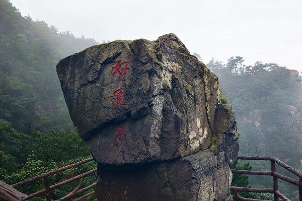 好运石,都被人摸的光滑滑,此时云雾已经升腾上来,后边也听到游人的喧闹声,而且越来越近,于是加快脚步,争取在赶上我之前,我得先到对面那个高峰,去了才知道那就是险峰,不然拍照就得耽误时间,摸了摸好运石出发。