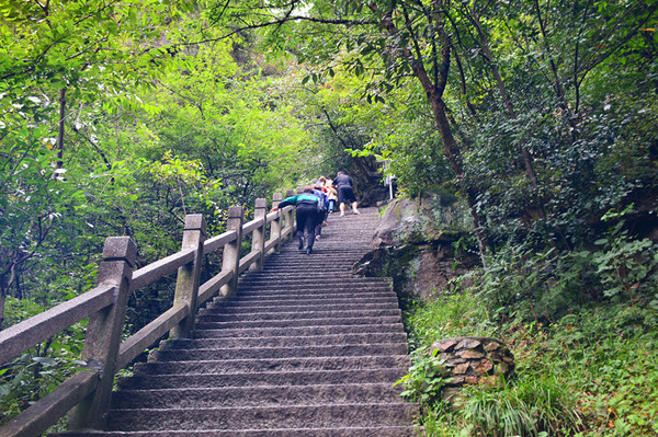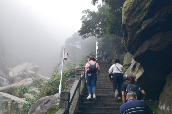 走了好一会儿,石阶越来越不像游客走的,下边也没有人上来,也开始有点犹豫,因为徒步衡山的时候就出现过类似状况,有些野路子纯粹是徒步爱好者自己趟出来的,安全存在不确定性,但转而一想,这个路都铺有石阶,而且一路而上,最起码是向着庐山顶的方向,于是打消顾虑,奋力盘桓吧,果不其然听到了说话的声音,陆陆续续有下山去三叠泉的游客,相互鼓励,注意安全,非常温馨,也才知道上去就是五老峰。