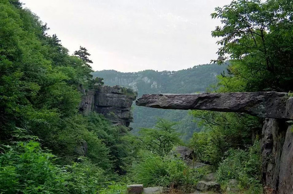 相传朱元璋与陈友谅大战于鄱阳湖,后朱元璋兵败被逼逃上庐山,带着所剩无几的残兵败将慌不择路逃到了悬崖边,下临深谷,前无去路,后有追兵,正在这危急之时,突然甩腿誉天降金龙化作虹桥,朱兵马刚寒灶芝刚过桥脱险,刹时晴天霹雳巨响,龙飞桥断,就此留下天桥奇观。后来朱元璋做了皇帝,这一美好传说厚誉流传至今。后人就势修筑一凌空巨石于深涧上游端立照底尝府淋部,游人或蹲或立于巨石前端,以远处悬崖作才炼脚腿背景,利用视差可以拍赠戏愚多得一张感觉惊险的"天桥留影"。其实吧,拍出效果看似惊险无比,实则挺安全的,也就两米左右吧。