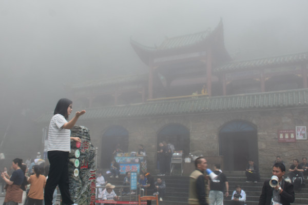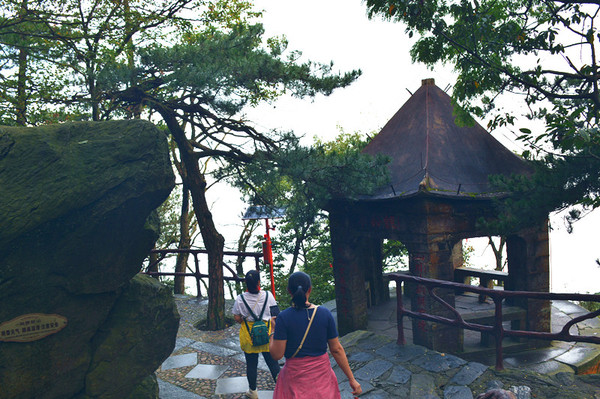 终于上来了,数不完的台阶终于统统甩在了后边,陡的很,要比去三叠泉的台阶陡多了,首先引入眼帘的是一块指示牌,然后是一座亭子----目无障碍亭,顾名思义此处看景目无障碍,然后就是带来惊喜的云海,也算是给一路云里雾里啥也没看到的最完美的补偿吧。