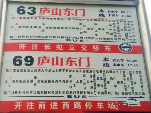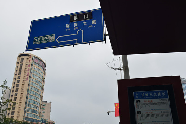 出了九江火车站,往右走,在街道十字交叉处再往右转,就到了浔南大道,往前走一小段路看到这个路牌,下边就是63路公交车站点---长虹立交桥东站,上车才知道,终点站就是海会镇庐山东门,可也经过庐山北门。因此你要是乘坐火车到了九江火车站的话,去到庐山除非你要打的,乘坐公交是非常方便的。