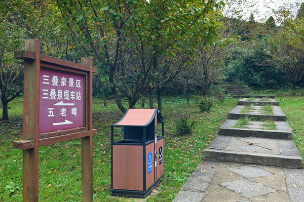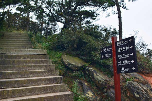 一路算得上是坦途吧,不一会儿也步行至缆车上站,游人明显少了不少,再没有三叠泉的喧闹,我出来就是徒步爬山的,这个选择是我的一大喜好,看到五老峰的指示牌一阵欣喜,过了一条公路再次看到指示牌,于是毫不犹豫的准备登级而上,路边的一对小情侣问我五老峰是不是走那个路,因为石阶上落叶杂草给人感觉就是一条野路子,我哪知道,估摸判断力一下果断出发。