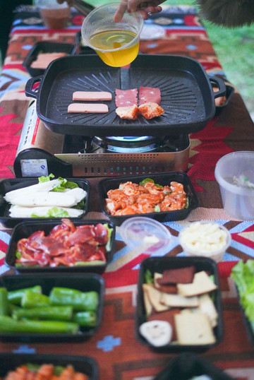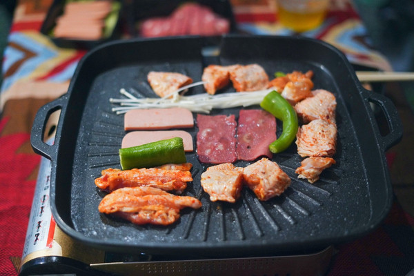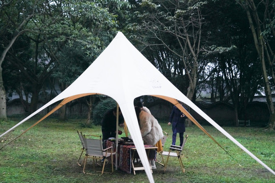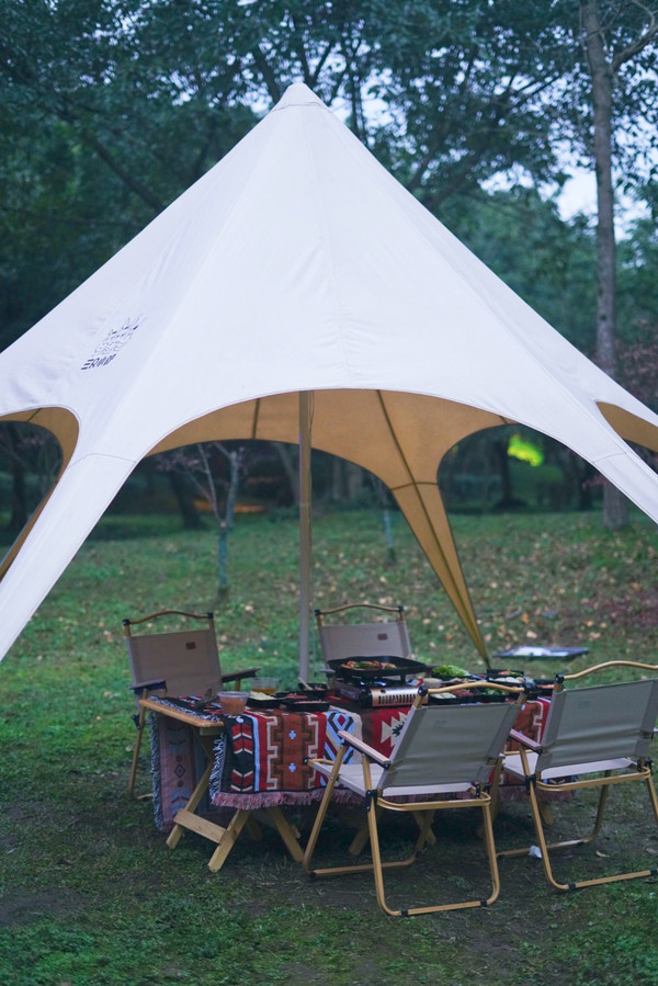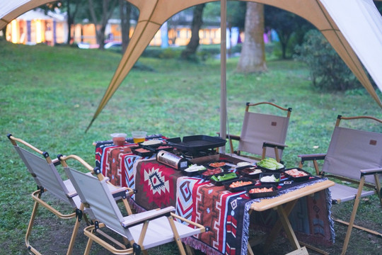 在峨眉山的温泉中心外的草坪之上,有一户外露营区域,展开露营帐篷。同好友们围桌而坐,迎着微微清风,看着烤炉下熊熊烈火燃烧,将准备好的食材,放在烤盘之上,看着肥美的肉片,在温度的作用下滋滋作响,从生到熟,蘸上灵魂干碟,放入口中,在小酌一杯,妙极了。