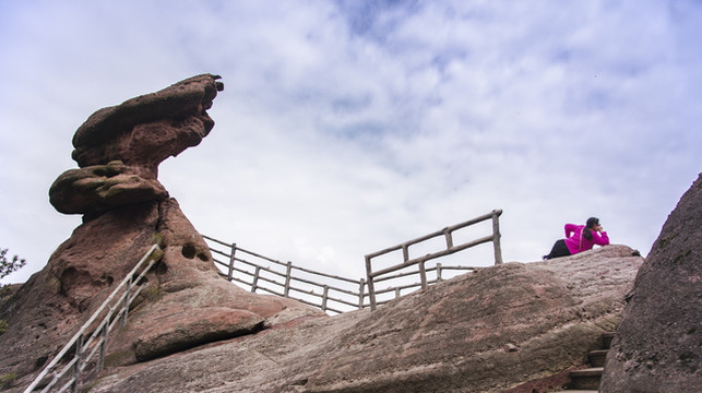 往上至骆驼峰观景台。抬头看,那一峰雄壮的骆驼站在龟峰景区的最高处,神定气闲、傲视万物。龟峰的很多象形景观似乎都能找出可以替代的名称,唯骆驼峰形神兼具,非其莫属。