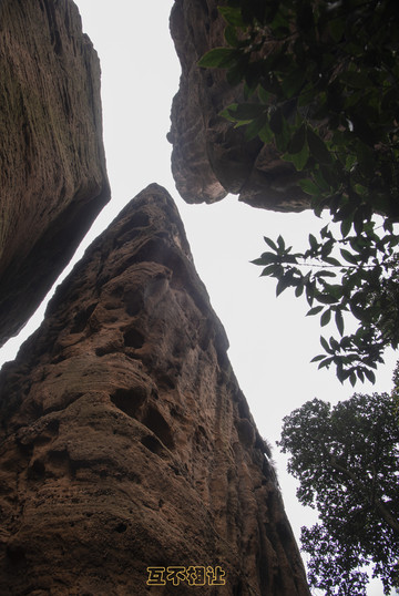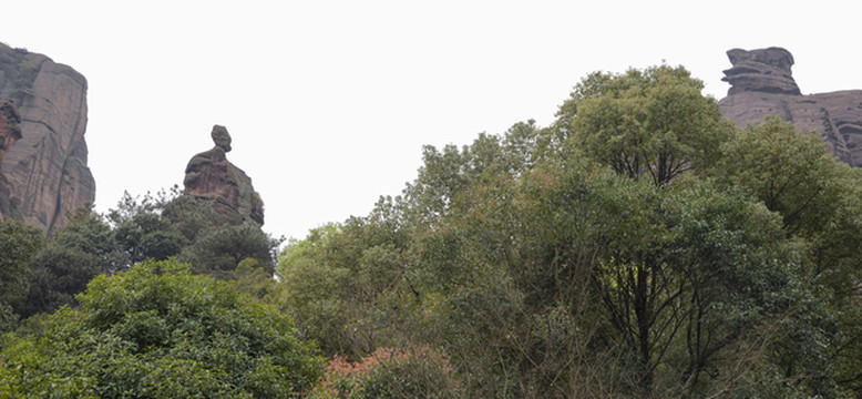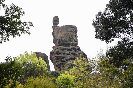 拾级而上,在振衣台附近从另一个角度二看老人峰。老人摇身一变,成了一块三足鼎立、看上去摇摇欲坠的奇妙石头“三足鼎镬”。老人峰无声地提醒人们,换个角度,就能看到不一样的风景。老人峰在山谷林间坐了不知多少万年,前面的山壁如屏风,挡住了视野,老人只能静静望着山顶上那三只叠在一起三叠神龟,他们就这么互相守望着,地老天荒,相看两不厌。