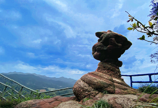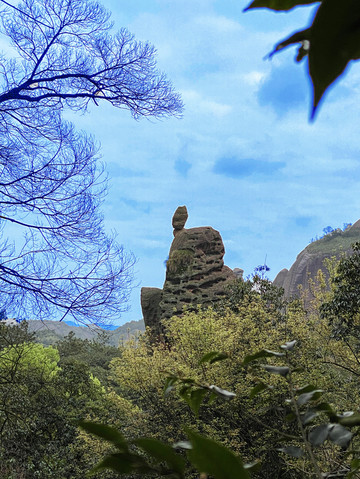 走过将军楼,奇岩怪石呈眼前。仔细一看,那块最抢眼的石头就是刚才在鳌鱼峰看到的“老鹰戏小鸡”一景中的那个小鸡,它亭亭玉立在一巨石上,既不像小鸡,也不像别的什么动物,难以名状;那只老鹰像变戏法似的,不见踪影,大概已变成了旁边的那堵山墙。真是步移景换,妙趣横生。幸福的大妈们也发现了这个绝佳留影地,争先恐后上巨石,美目顾盼,搔首弄姿,成了一道风景中的风景。