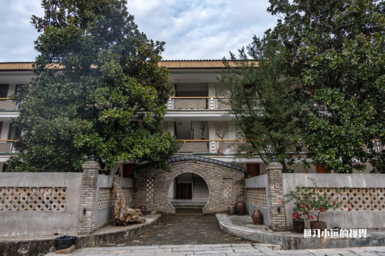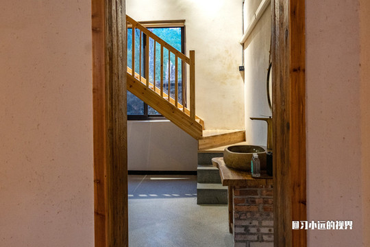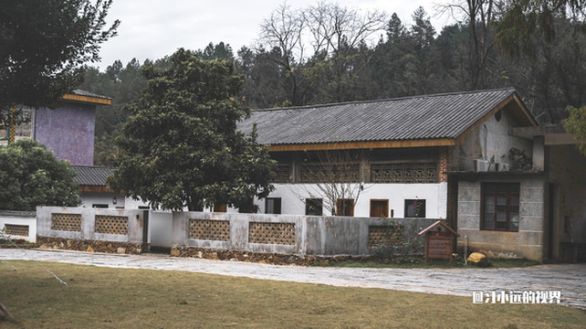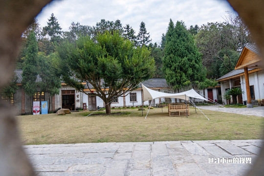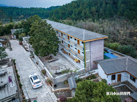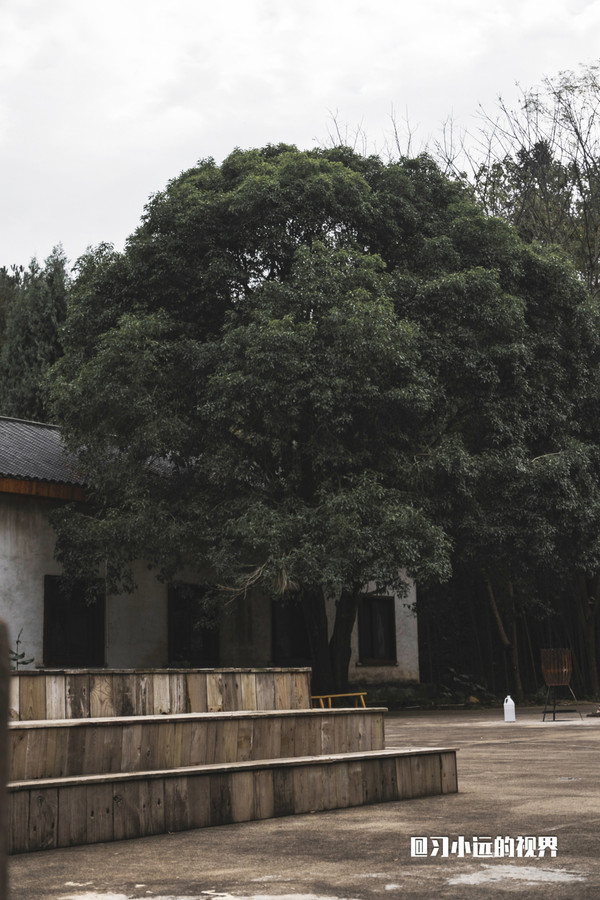 这里四面环山。庭院里也是被植被覆盖的密集,整个民宿是由厂房改造的,一切看起来都很有味道,几幢不同的厂房分别做成了住宿区,前台,大食堂。住在这里,有种远离喧嚣,归隐山林的感觉。而且这里的树木都给人以舒服的感觉。整个厂房的外观都很素雅,配上简洁的内在,让住的人不由得喜欢这里。