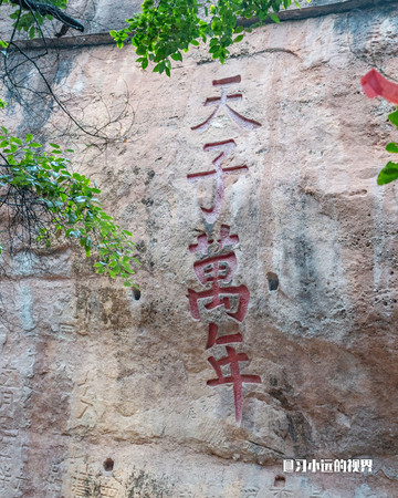 寺东悬崖上能分辨的有15品,宋代石刻最多,目前发现最早的石刻宋皇祜三年(1051年) 石刻,就在这里悬崖上。悬岸上端最醒目的石刻,宋代民统英雄岳飞的“天子万年”题刻。