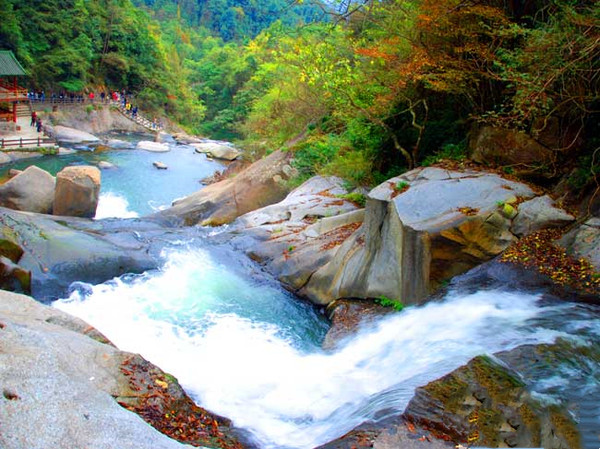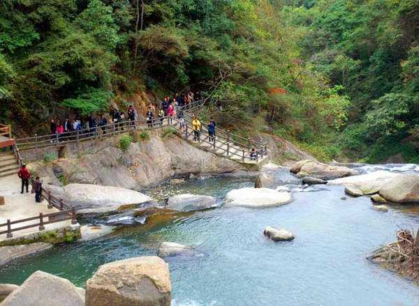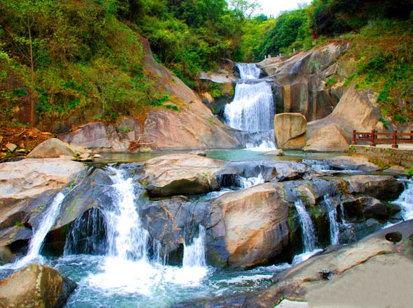 顺着山间栈道,先下而上,会让游客们领略八潭八瀑连贯而泻,蔚为壮观的风采;从一瀑到八瀑直线距离约500米,蜿蜒台阶2000多步,已被誉为“江南第一瀑布群”;瀑布或窄或宽,叠飞而下,声播如雷,飞瀑流泉,似长河倒挂,如玉带飘舞,像珠玉垂帘。