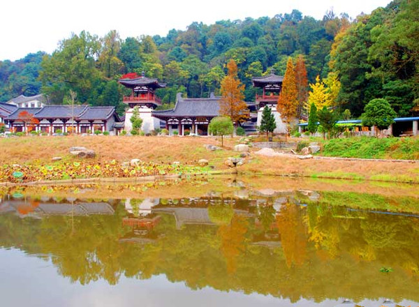 接着,顺着五彩斑斓落叶铺就的弯弯曲曲山道,经过逢渠桥、木鱼石、山中飞练瀑布、夜合山塔林等古迹景点登山拐过一个弯儿,眼前一片豁然开朗,在一片开阔的水潭后就是坐落于山中的洞山普利禅寺。