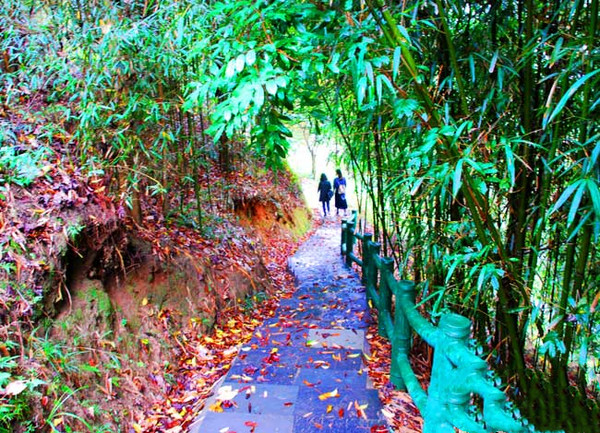 穿过广场一侧就是前往毛泽东化险处的一座山,山下有通往上山的石阶观光栈道,顺着山间小道攀爬到山腰的位置就是当年毛主席遇险的所在地。