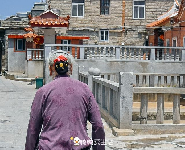 在她身上看到了惠安女的特色发髻,惠东老年妇女一般在脑后梳一发髻,近似长方形,然后套上发网,压平,左右各插一个别子,上方和中部各插一支梅花,再围上一条黑巾,用饰有珠花的别针别上。