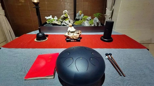大堂放有羽罄,跟着曲谱以锤轻敲对应的数字,叮咚而起的小曲饶有小情趣。