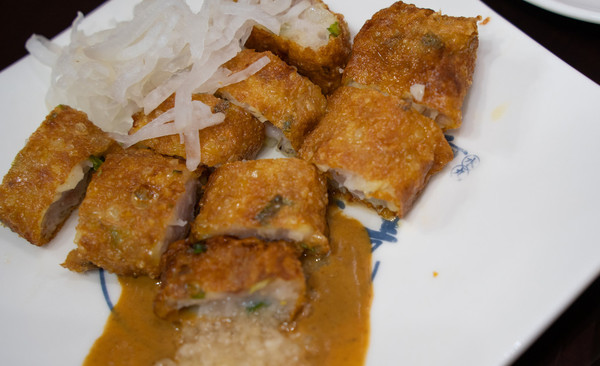 店内必点的是水丸汤和炸鸡卷,水丸汤一碗10元,水丸又大又有料。汤是骨汤,撒点葱花,加点胡椒粉,又香又好喝。炸鸡卷则是闽南有名的小吃,里面还加了马蹄,味道很不错。