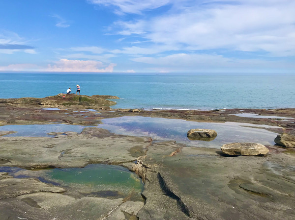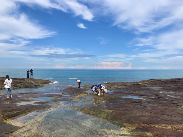 海水映着蓝天成碧色,礁石上的苔藻,且绿且红。