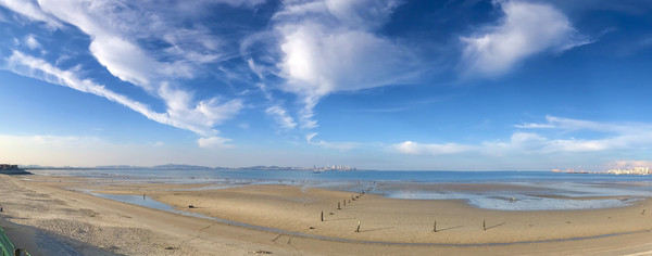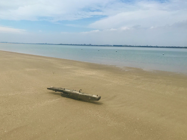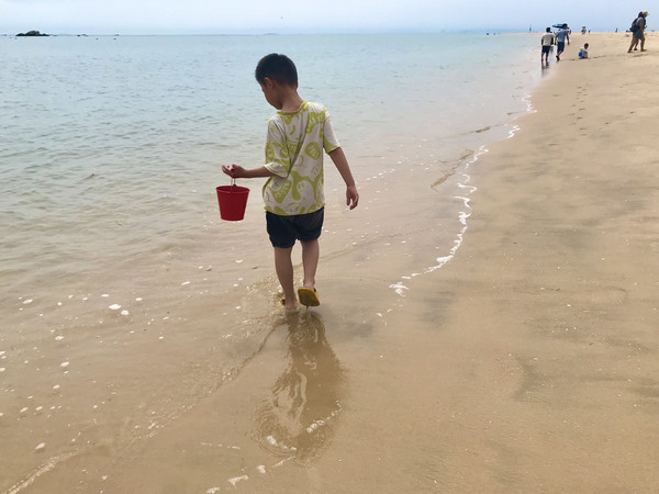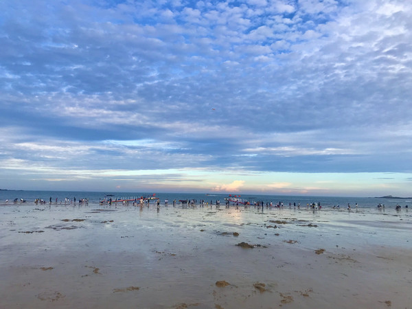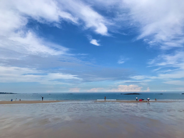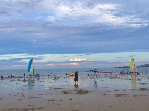 沙滩很平,想必是涨潮的时候水漫上来,把一切痕迹都抹平了。若涨潮时来踩水,应该也是好玩的。