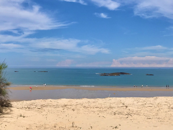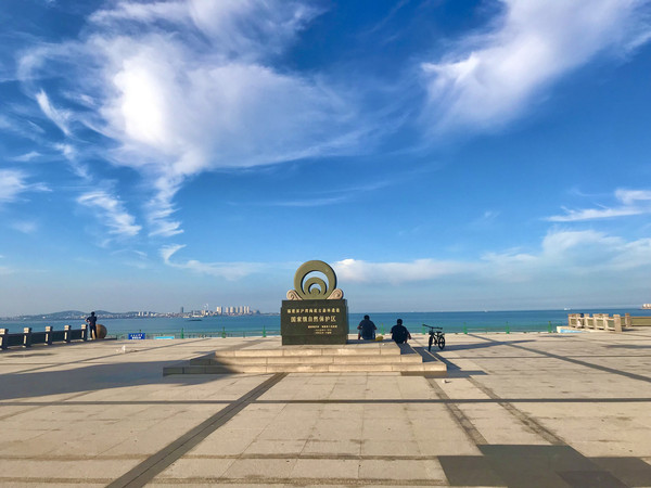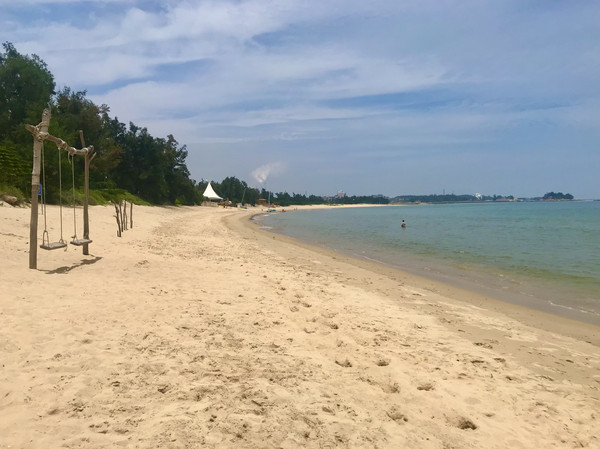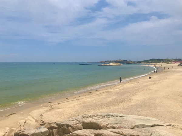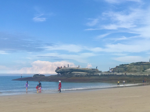 金色的沙子像条带子,在远处拐了个弯。后来才知道这片沙滩叫触角沙滩,长1.3公里,宽却只有100多米,像触角一样向大海延伸,在尽头形成一个逗号,又叫玉带滩,堪称奇观。