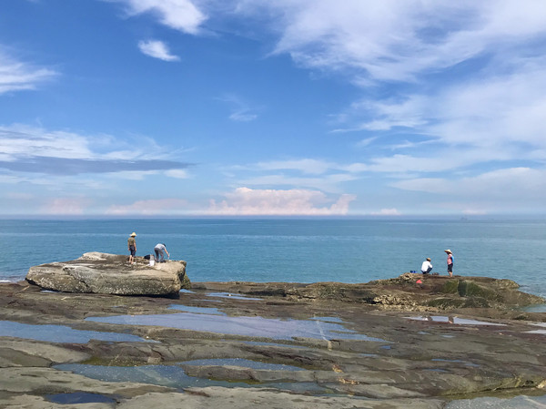 出乎意料,海角的另一面不是沙滩,而是大片的礁石,有颜色的礁石!