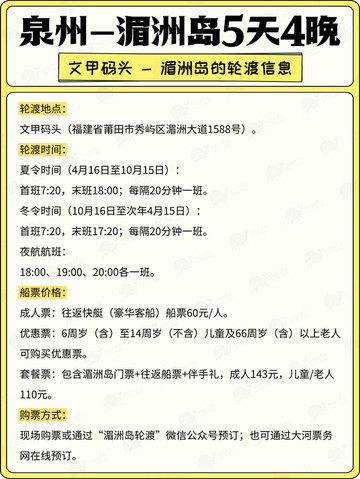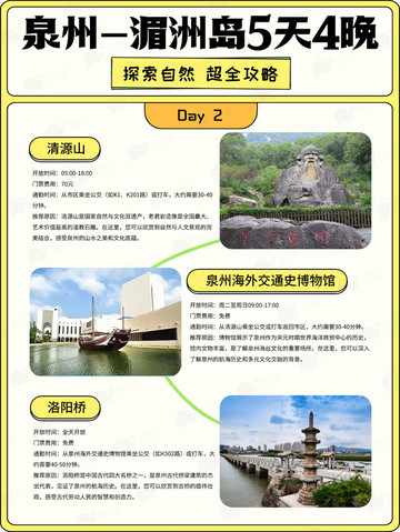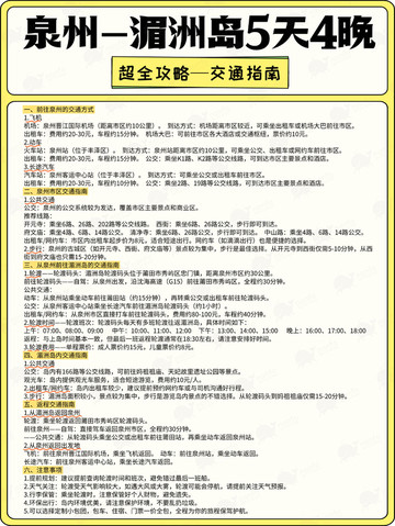 🚗泉州城内出行,公交方便且能看街景,部分景点打车也不贵。去湄洲岛需先到莆田文jia码头,可从泉州坐动车到莆田站,再转公交或打车前往码头,乘船约 20 分钟登岛🛳