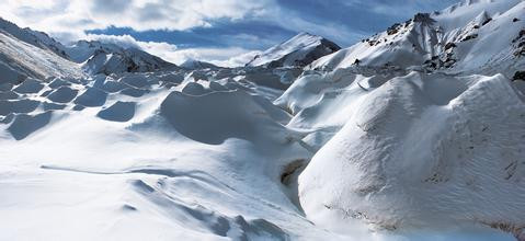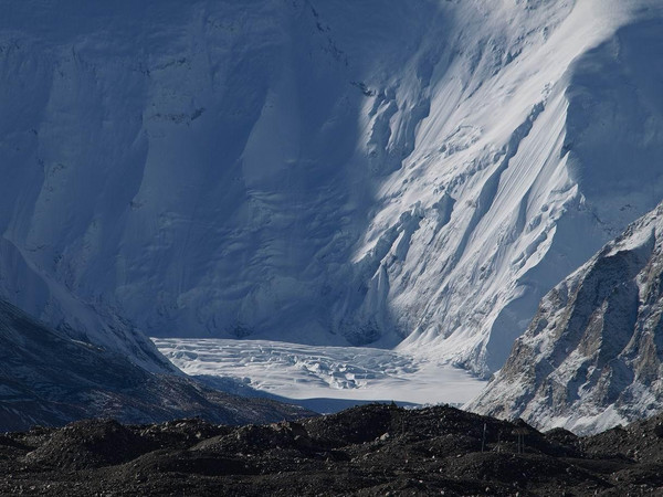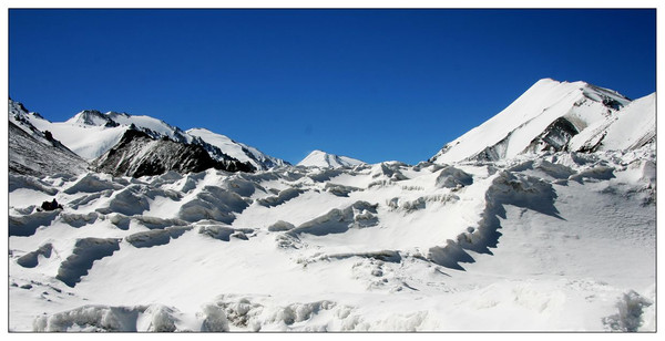 特拉木坎力峰发育在源头海拔6000米左右的昆仑山,昆仑山上有两个巨大的围椅状冰盆。冰盆三面冰雪覆盖,积雪随时可以崩落,直立的雪崩槽如刀砍斧劈般,在几个小时内就能观察到三次雪崩。频繁的雪崩是冰川发育的主要补给方式吧。冰盆中冰雪积聚多了,就会已流出来,它以巨大的冰瀑布形式跌落入米堆河源头冰盆地中,冰瀑布足有七八百米之高,景象奇特,气势宏伟,实属世间少见,不由地赞叹着大自然的造化!