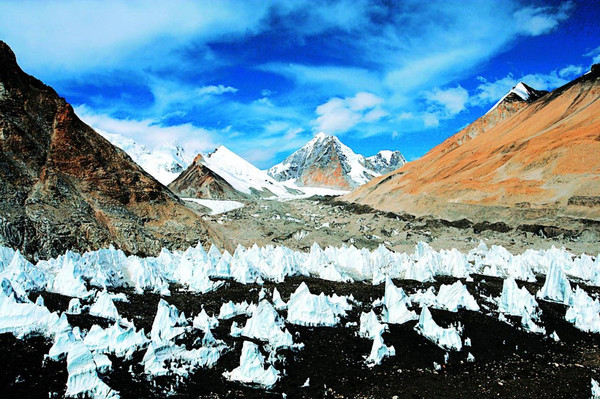 冰蘑菇,是大石块被细细的冰柱所支撑,有的可高达5米。冰桥象条晶莹的纽带,连接着两个陡坎,象是有意为两个陡坎“保媒搭线”。冰墙陡峭直立,象座巨大的屏风,让人生畏。冰芽、冰针则作为奇异美景的点缀,处处可见。最令人称奇的还要数那千姿百态的冰塔林了。在海拔5700米到6300米的地段,是“水晶宝塔”——冰塔林的世界。珠峰北坡绒布冰川上,发育有5.5公里长的冰塔林带。乳白色的冰塔拔地而起,一座接一座,高达数十米。有的象威严的金字塔;有的象肃穆的古刹钟楼;有的象锋利的宝剑,直刺云天;有的象温顺的长颈鹿在安详漫步,个个晶莹夺目。难怪人们都说,进了冰塔林,就把如同自己置身于上苍的仙境中了。