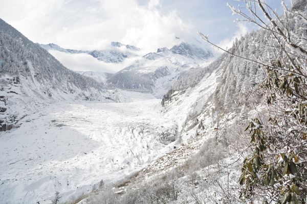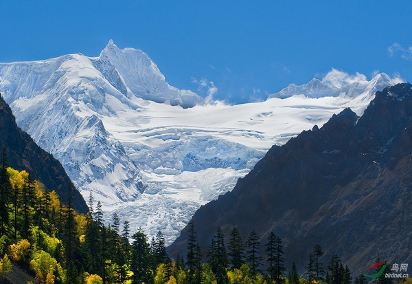冰瀑布宽达1100米,落差1080米,由无数极其巨大的光芒四射的冰块组成,仿佛从蓝天直泄而下的一道银河。除非你亲眼见到,没有任何词汇能形容它的瑰丽笥伟大。海螺沟冰川最高点的海拨为6750米,而最下端的海拨高度仅为2850米,它不但是低纬度低海拨的冰川,而且是落差最大的冰川。