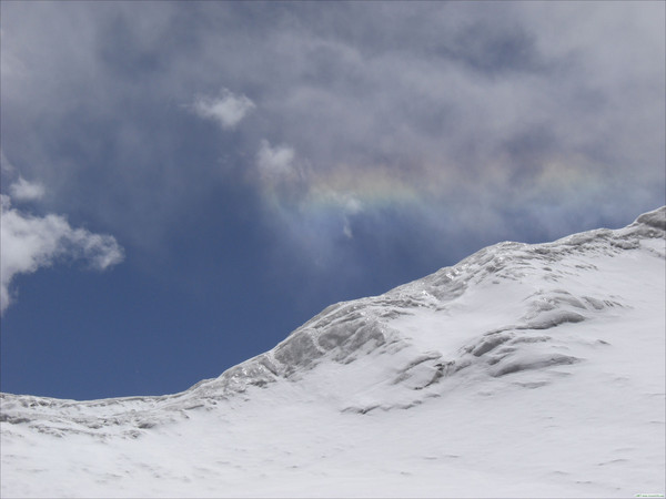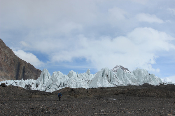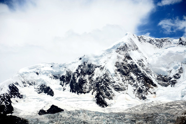 在5800米左右的冰川上,举目所及,一片洁白。天公造物,神奇无比,令人目不暇接,那宛如古代城堡般的悬岩,层次分明,风化岩石形成的高大石柱、石笋、石剑、石塔,成群结队,风情万种,绵延数公里。