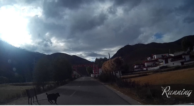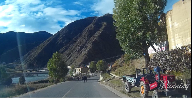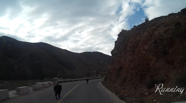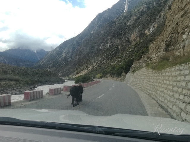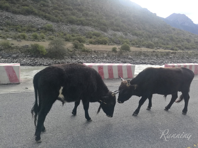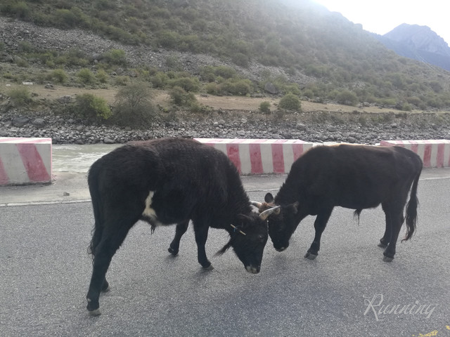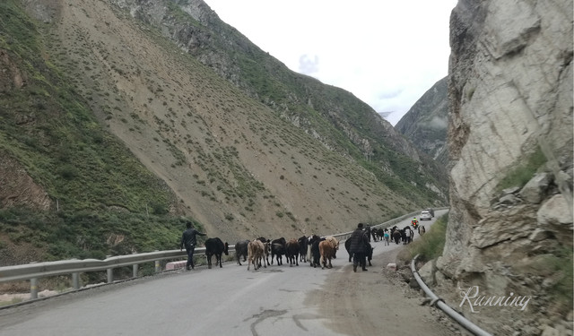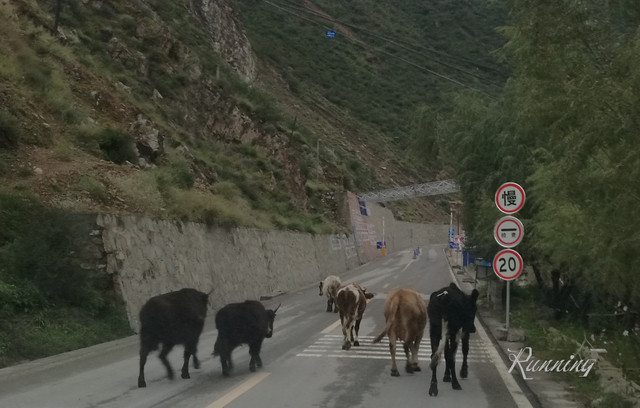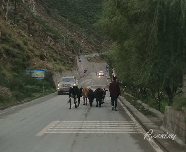 一转弯,看到两队牛群横行霸道——先生大笑着踩刹车减速摁喇叭。。。牛真是很牛的,侧头看看,视若无睹;还好,牛主人立刻拿着鞭子吆喝着叫它们靠边让行。哈,估计也见惯了,牛群立刻让出一条道来。我们擦牛而过。