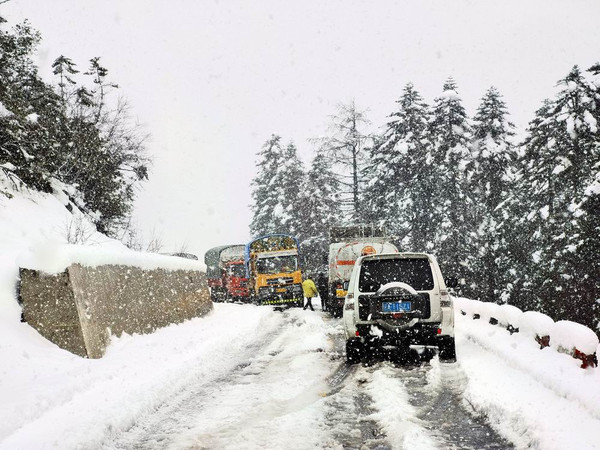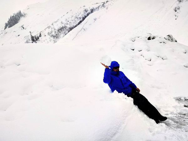 墨脱境内多高山,山上多积雪,以前,墨脱境内的人想要离开墨脱,只能选择在晚上结伴翻越雪山,因为白天气温高,冰雪会融化,假如再遇见地震,极有可能变成雪崩,随时会有生命危险。图为等候的游客在雪地上拍照。