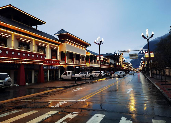 波密县城所在地扎木镇,海拔2700米。气候温和湿润,年均温8.5℃。图为波密扎木镇夜景。