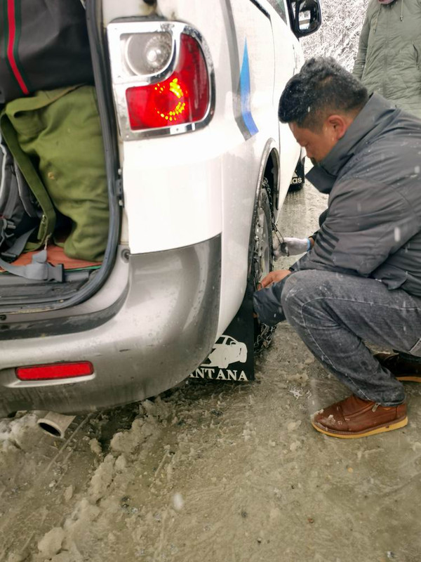 原来一辆藏民的双驱车,上不去坡了,停下来装防滑链。