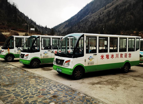 从318国道附近的入口,到米堆冰川的观景台,还有8公里,进入景区后要先做区间车,再步行前往。图为景区的区间车。