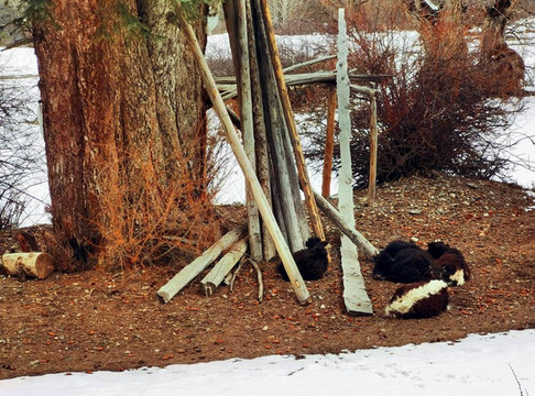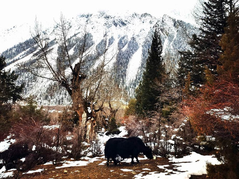 “夫妻树”下有休息的牦牛。