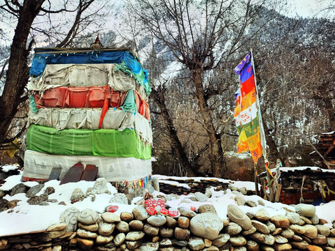 往里面走,就是崎岖山路了。路边有招展的经幡。