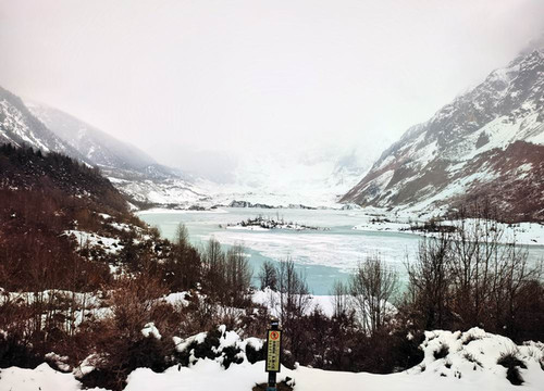 冰川主峰海拔6800米,雪线海拔只有4600米,常年雪光闪耀、景色神奇迷人。冰川冰洁如玉,景色秀美,形态各异,姿色醉人。但我们运气不太好,云雾把冰川完全覆盖住了。