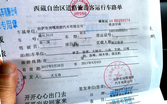 坐上邓师傅的“通用别克商务”,经“雅江特大桥”跨越雅鲁藏布江,再沿机场高速驶向拉萨市区。邓师傅向我们展示“旅游客运行车路单”,他说正规的旅游包车都有行车路单,车牌号都是“藏AL”牵头。他还说,这部车的产权属于公司,他自己算是打工,包车费是他与公司对半分成,公司要负担跟旅游运营有关的全部费用,剩下的一半扣除油费就全为他自己实得。不过,公司并不负责为他揽活,揽活全靠他自己。
